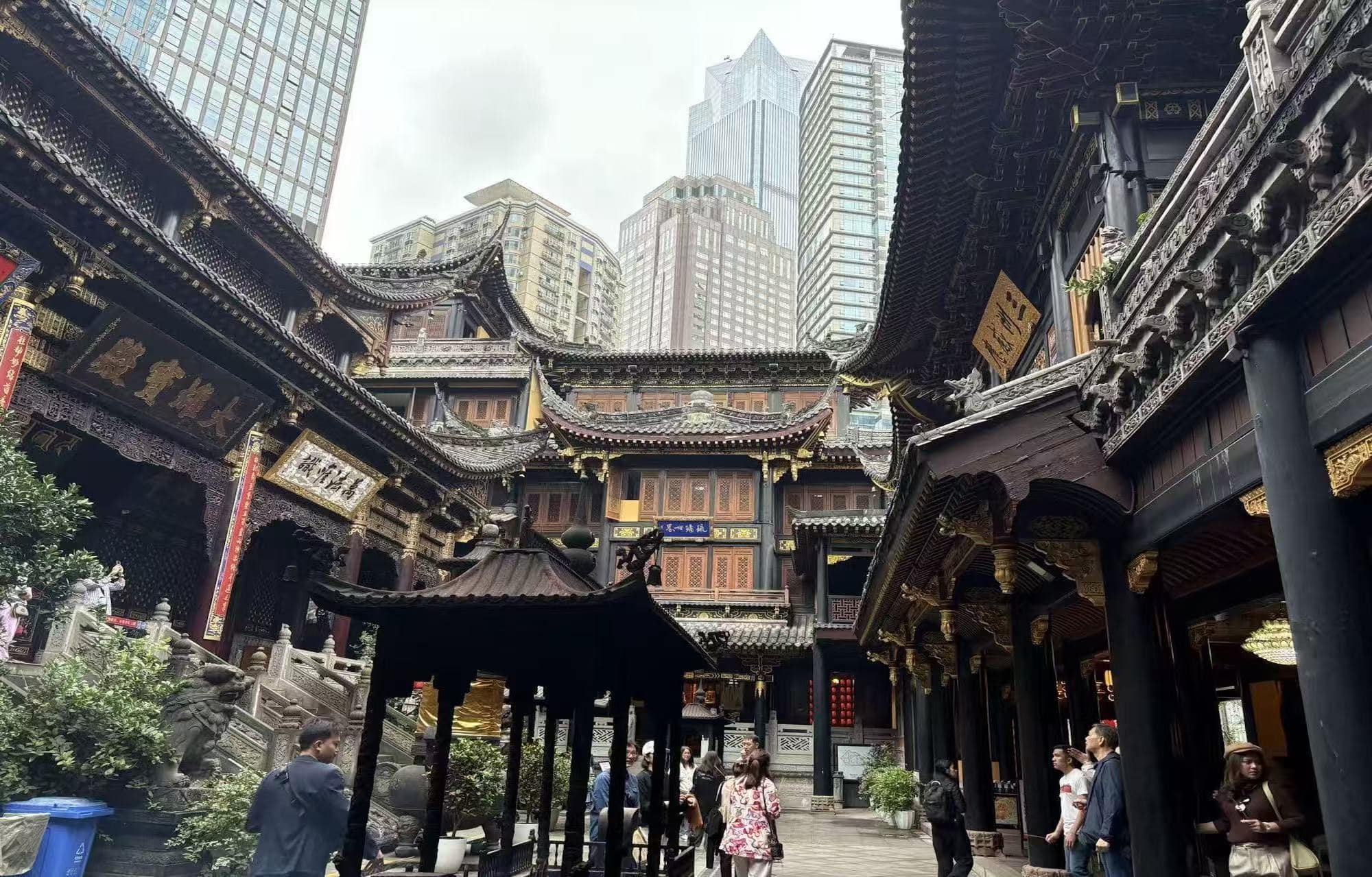 - 10 月 13 日,飞往重庆。10 月 14 日,游览重庆罗汉寺,很神奇,把现代建筑当做背景的一座精致、立体的寺庙群。