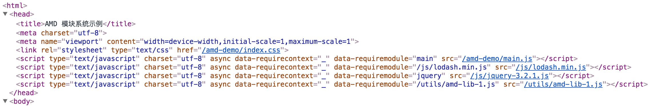 页面就绪后,我们可以在渲染后的 DOM 树中看到 <head> 标签里多了几个 <script> 元素,Require.js 正是通过这些标签来加载相应的 AMD 模块文件的:
