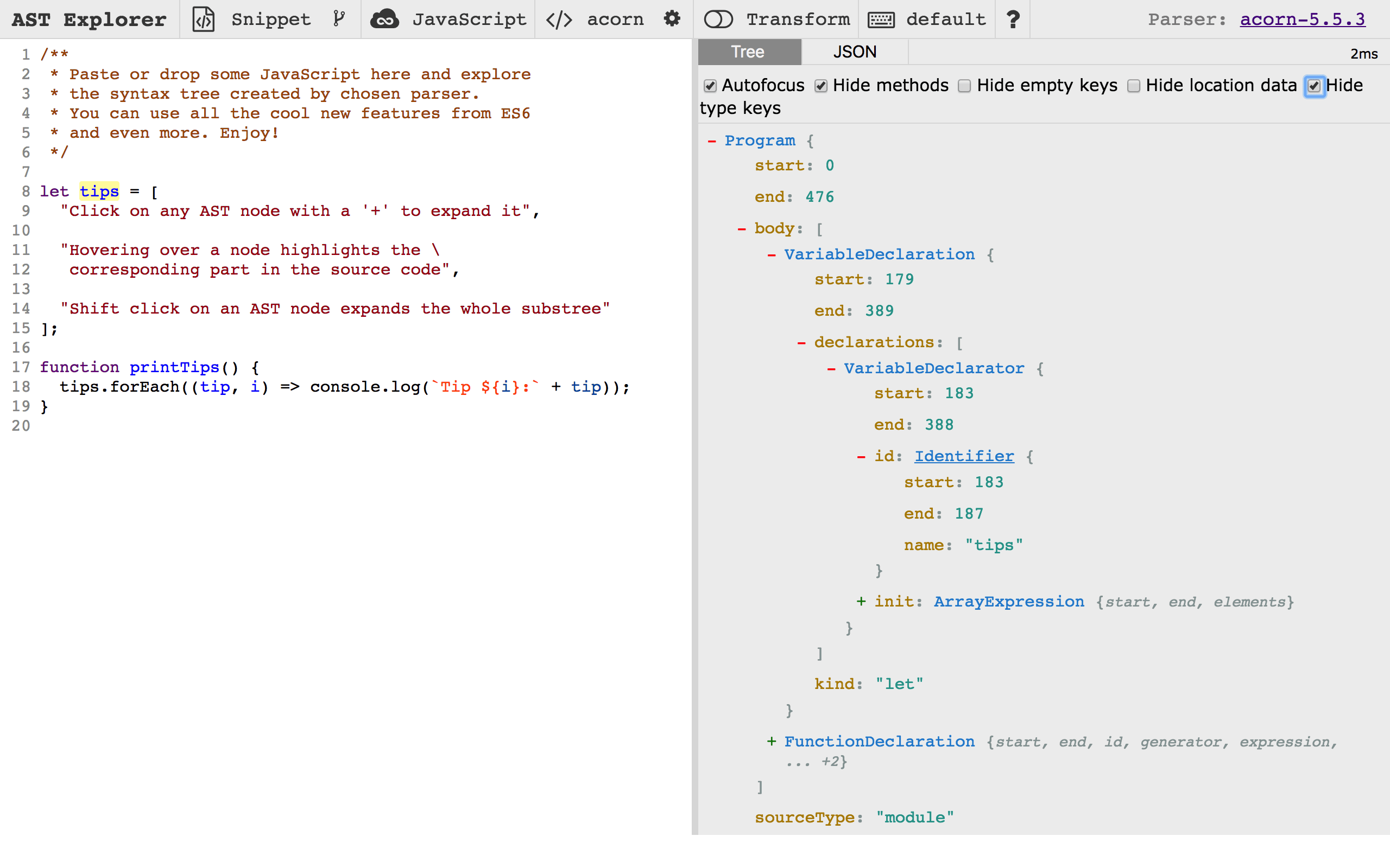 在 https://astexplorer.net 网站可以非常直观地看到 JavaScript 源代码与其对应的抽象语法树每个节点之间的对应关系: