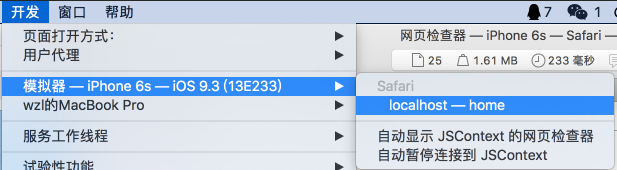之后,在 Simulator -> Hardware -> Device 里可以切换为已配置过的模拟器。当选择了较高版本的 iOS 后,Simulator 可以与 Mac OS 的 Safari 浏览器通信,以便对 Simulator 里的 iOS Safari 进行调试。首先打开 PC 版的 Safari,然后选择 开发 -> 模拟器,选择当前的 Simulator 打开的页面。