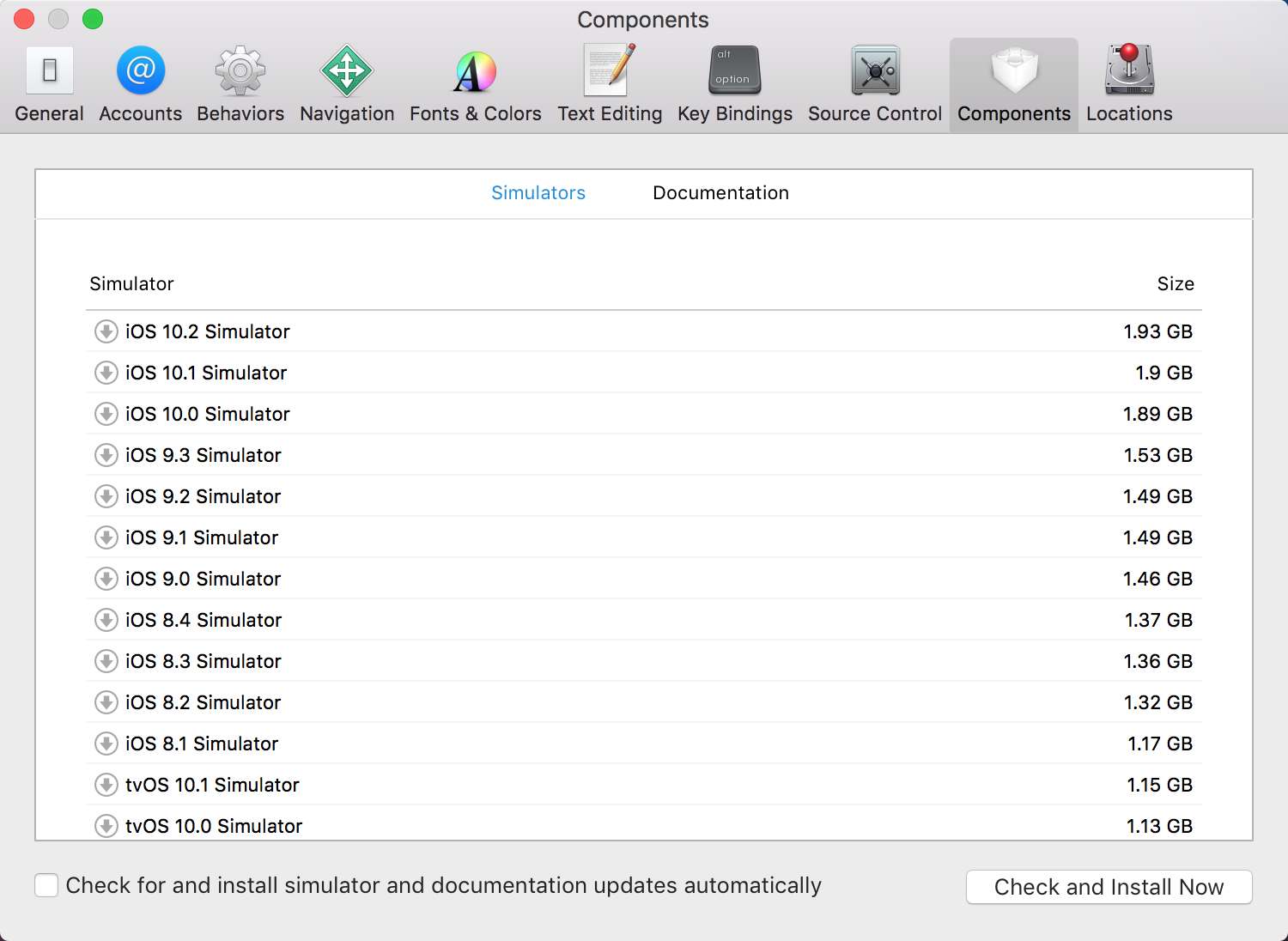 如果要安装某个特定版本的模拟器,可以在 XCode -> Preferences -> Components 里找到对应的版本然后下载: