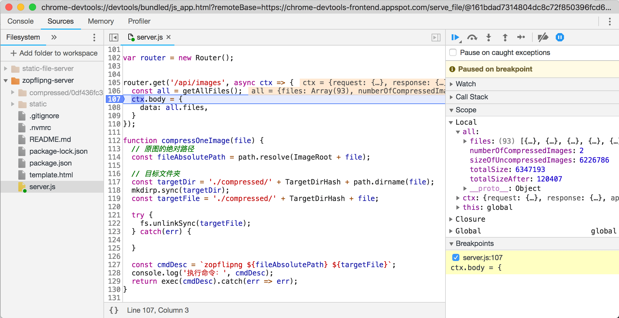点击上图里的 inspect,会调起 Chrome 的 DevTools 界面,在 Sources 模块中选择 JavaScript 程序所在目录,就可以像对浏览器端的 JavaScript 代码一样进行调试(例如设置断点):